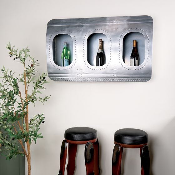 Bring the feeling of cruising at 35,000 feet right into your home or hangar with this striking aircraft window wall panel. Handcrafted from lightweight polished aircraft-grade aluminum with authentic rivet detailing, this wall art features three iconic oval airplane windows framed in a beautifully contoured fuselage section. Subtle backlighting adds a soft, cockpit-style glow, making it just as eye-catching by night as it is by day. The lights are rechargeable via a type-c charger. Whether you're building out a pilot’s lounge, adding character to a hangar, piece delivers instant aviation atmosphere. Subtle backlighting adds a soft, cockpit-style glow, making it just as eye-catching by night as it is by day. Easy to display, hanging hardware included. Weighs 20 lbs., and measures 39.5”l x 24”h x 7”d.