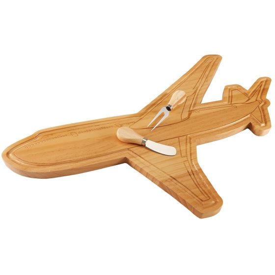 Introducing the ultimate kitchen companion for aviation enthusiasts and culinary adventurers alike—the Airplane-Shaped Cutting Board Kit. Shaped like a classic airplane, this cutting board is made from premium, sustainably sourced wood, the cutting board offers durability and a smooth, polished surface that's gentle on your knives. The natural wood grain adds a rustic elegance to your kitchen decor. This set includes a matching knife and fork, perfectly sized and balanced for versatile use. Whether you're slicing, dicing, or serving, this kit has everything you need to make meal preparation a breeze. Simply hand wash with warm, soapy water and dry thoroughly. Regularly apply food-grade mineral oil to keep the wood looking its best and to maintain its longevity. Board measures 25”l x 1” thick with a 19” wingspan.