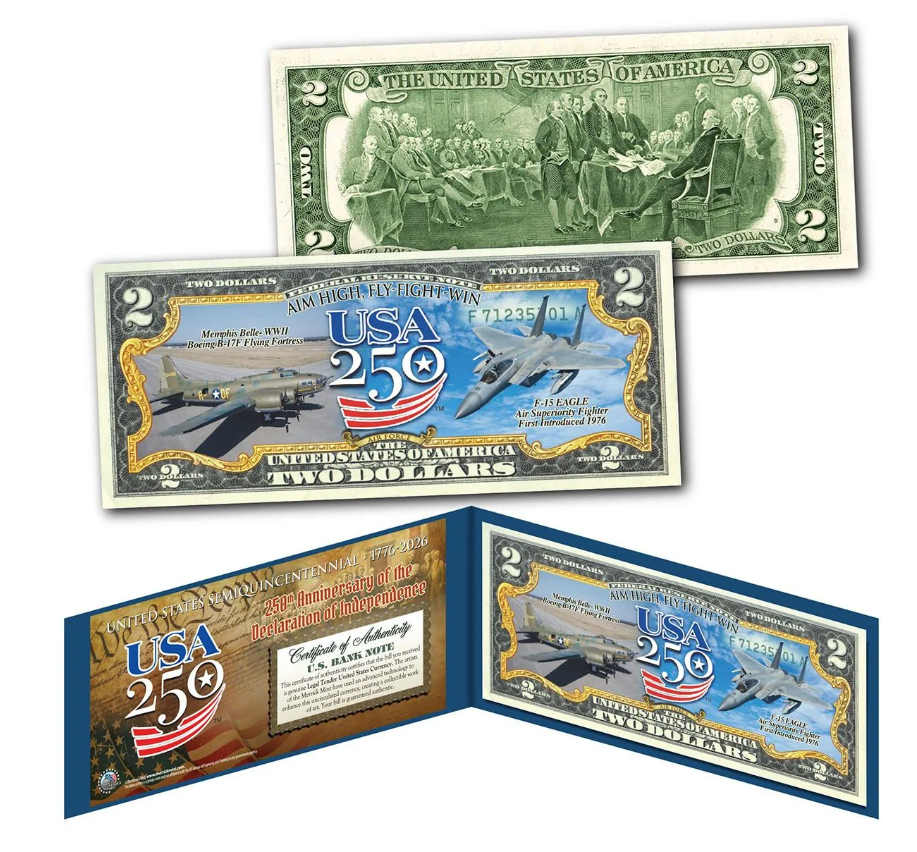 Featuring iconic American aircraft like the B-17 Bomber and the F-15 Strike Eagle, this genuine legal tender $2 bill celebrates 250 years of independence for the United States of America. The full colorized images are accomplished through a revolutionary new authentic colorization process, creating a collectible work of art. t is the only U.S. Currency note that features two Presidents, John Adams and Thomas Jefferson, and it is one of the most rarely seen bills in circulation and actual use. Made in the USA.