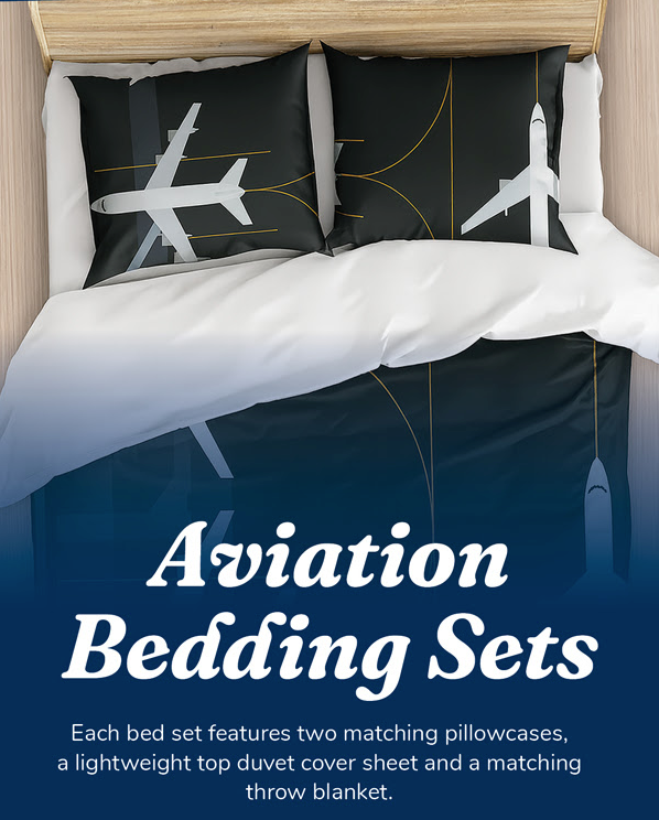 Our Aviation Bedding sets feature two matching pillowcases, a lightweight top duvet cover sheet and a matching throw blanket made of 100% polyester. Bed sets are available in twin, queen or king sizes, please specify size. Shop our collection here.