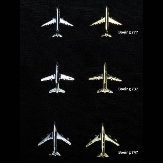 Add this elegant pin to your lapel, tie, or flight bag. Popular commercial aircraft available.