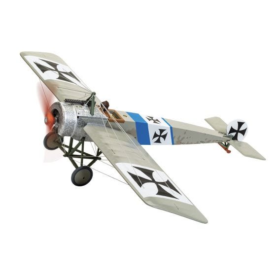 The Fokker E.III Eindecker, commonly known as the Fokker Eindecker, was a German monoplane fighter aircraft used during WWI. It was developed by the Dutch aviation pioneer Anthony Fokker and played a significant role in the early stages of aerial warfare. The Fokker Eindecker was notable for being the first true purpose-built fighter aircraft, specifically designed to carry a forward-facing machine gun synchronized with the propeller. This synchronization system, known as the interrupter gear, allowed the pilot to fire through the propeller arc without hitting the blades. Prior to this innovation, pilots had to use cumbersome devices to fire their weapons, often at a severe disadvantage. The Fokker Eindecker series began with the E.I in 1915, followed by the E.II and the E.III. The E.III, introduced in late 1915, was the most successful variant. It featured improvements over its predecessors, including a more powerful engine and refined aerodynamics. Please note; some parts are plastic. Includes a display stand and the Model is screwed into the base. You can remove the Model from the base by unscrewing the Phillips screw heads. Measures 6”l with an 8” wingspan.