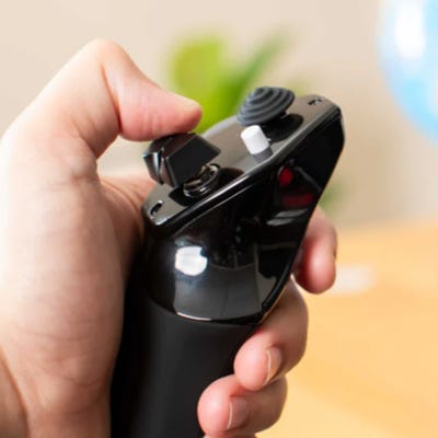 Features one 8-way hat switch, two Vertical 2-way rocker switches, a button and a Push to Talk Button.