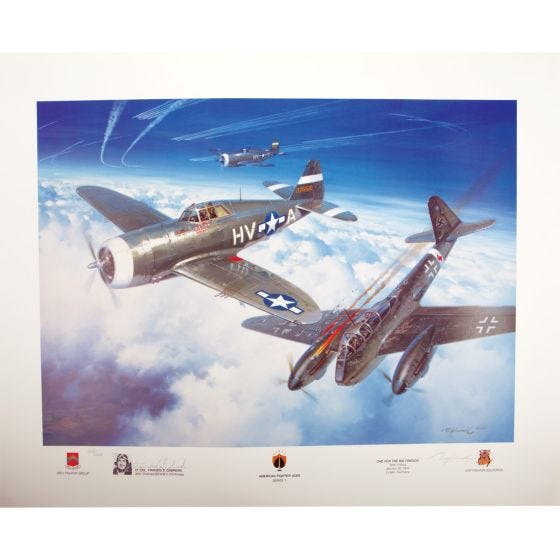 Legendary Ace Francis S. Gabby Gabreski flew his first 20 missions with the Polish Air Force flying the British Spitfire. February 1943, He was reassigned to the 61st fighter Squadron, 56th Fighter Group based at Boxted England. During his entire time with the Wolfpack Gabby flew the P-47 Thunderbolt. Most of the time escorting and protecting B-17s (Big Friends) on bombing missions into Germany was the priority for the 56th FG. Gabby got his first victory on August 24th, 1943 downing a Focke Wulf 190. He became an Ace on November 26, 1943 after destroying two Messerschmitt 110s. Includes a Certificate of Authenticity and measures about 30”w x 24”h.