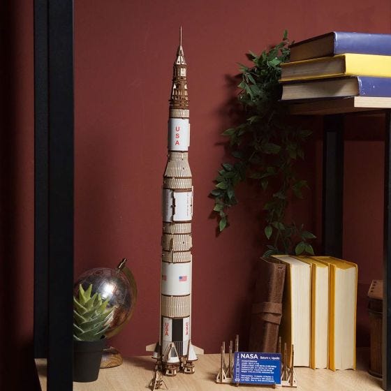 The NASA Saturn V rocket holds the record as the tallest and heaviest payload launch vehicle ever built, making it an iconic gift for space enthusiasts and adult fans alike. This legendary rocket powered 13 historic missions, including the 12 Apollo missions and the launch of Skylab into low Earth orbit. This 3D wooden model kit, crafted at a 1:170 scale, is a stunning tribute to this engineering marvel. As one of the most remarkable mechanical wooden puzzles inspired by space exploration, this DIY kit allows builders to recreate the Saturn V in intricate detail. This kit includes 500 high-quality plywood pieces, a challenging 4 out of 5 difficulty level, and an estimated assembly time of 7 hours. It also comes with a display stand and an informative card, making it perfect for showcasing your completed masterpiece. When assembled, the model measures 26.2”l x 3.9”w x 5.7”h. Perfect for fans of Apollo mission models, solar system puzzles, or anyone who dreams of assembling their own rocket or spaceship, it's an exceptional addition for hobbyists who appreciate the art of mechanical wooden models. Assembly is required, for ages 14 and up.