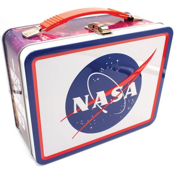 Blast off with this galactic NASA Tin Lunchbox, the perfect retro-inspired collectible for space lovers of all ages! Whether you’re packing your lunch or showcasing it on a shelf, this lunchbox is made for adventure—on Earth or beyond. Features include raised embossed artwork, sturdy tin construction, a durable metal latch, and a collapsible plastic handle. Measures 8.5”w x 6.75”h x 4” thick. Officially Licensed.
