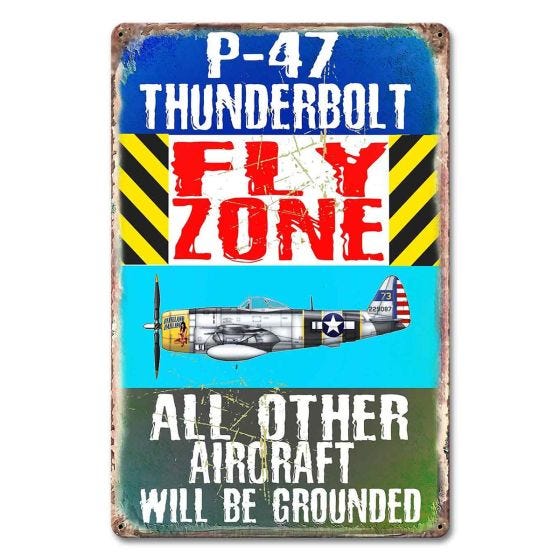 From the Phil Hamilton licensed collection, this P-47 Thunderbolt Fly Zone Vintage Metal Sign measures 12 inches by 18 inches and weighs in at 3 lb(s).