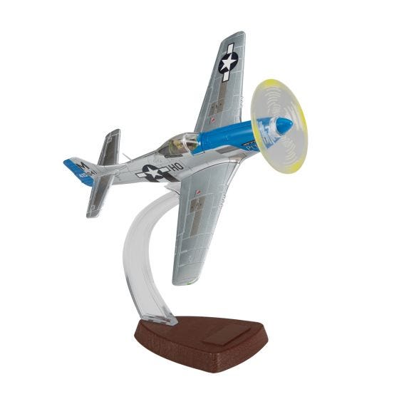 This 1:72 scale, Die-Cast Model is a replica of Lt. Col. John C. Meyers P-51D Mustang “Petie 3rd”, of the 487th Squadron, 352nd fighter group, USAAF in 1944. Model features a clear canopy revealing a well-equipped cockpit with a pilot, two rotating propeller configurations, optional position landing gear, weapons display, removeable engine cowl panels, a detailed engine, authentic markings, display weights and a panel/prop removal tool. The Model also includes two display stand options, one diorama stand and an in-flight stand that allows the Model to be displayed in various flight configurations. Model measures about 5”l with a 6" wingspan.