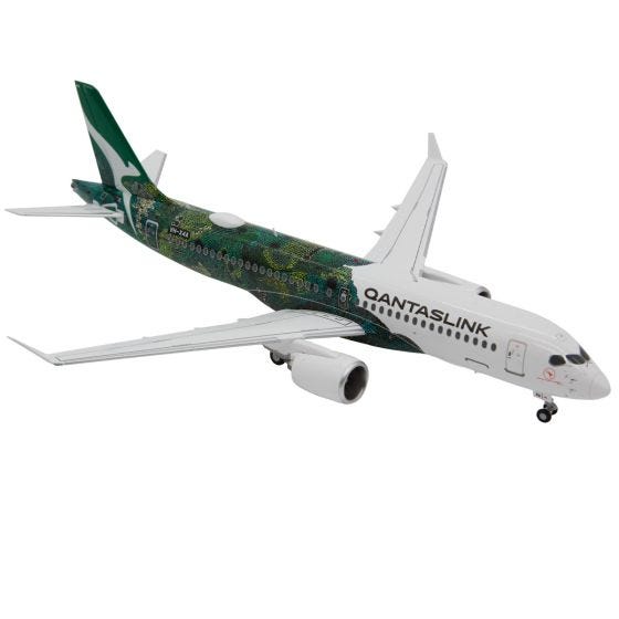 Adapted from Bombardier’s CS300 design, Airbus’ A220 line was designed to fill the 150-seat medium-range space. Comfortable and versatile, customers are treated to an exceptional passenger experience. Powered by two Pratt & Whitney 1500G engines, A220-300 aircraft can fly more than 4,100 miles non-stop at over 620mph. Part of Qantas’ Flying Art Series, VH-X4A’s exterior took weeks to complete. Guided by artist Maringka Baker, dozens of painters and more than one hundred stencils were utilized to create the stunning design. Named “Minyma Hutjara Tjuhuapa” and delivered in December of 2023, it has officially entered service as of March 1st, 2024.
