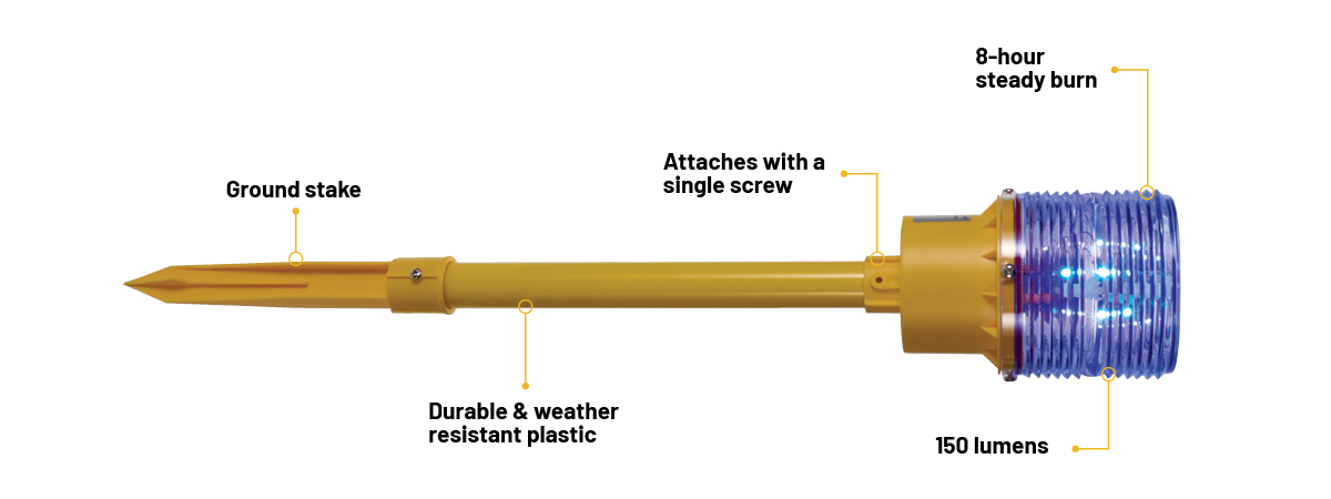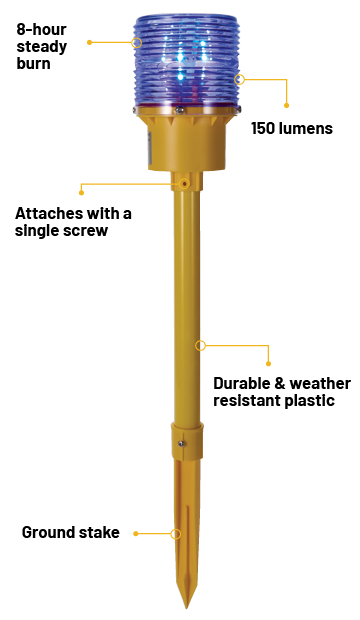 Bring the magic of the airfield to your own outdoor décor with our exclusively made high-quality solar-powered runway and taxiway lights! Designed to replicate authentic airfield lighting, these lights are perfect for pilots, aviation enthusiasts, or anyone who wants to add a unique touch to their outdoor space. Whether you're lining a driveway, marking a garden path, or creating a mini airstrip, these runway-inspired solar lights add the perfect aviation touch to any outdoor setting. Available in white for runway lighting, these lights automatically charge during the day and illuminate at night, creating a realistic and eye-catching airfield effect. A built-in switch lets you turn the light off during the offseason or whenever you prefer, helping to conserve battery life. Simple assembly is required, just mount the ground stake and the light housing onto the pole with a simple screw (included). When assembled the solar light with the ground spike measures 23” tall and the light measures 3.5” in dia. Solar light will produce an 8-hour steady burn when fully charged. Certainly not FAA approved, these lights are great for driveway and lawn approaches.