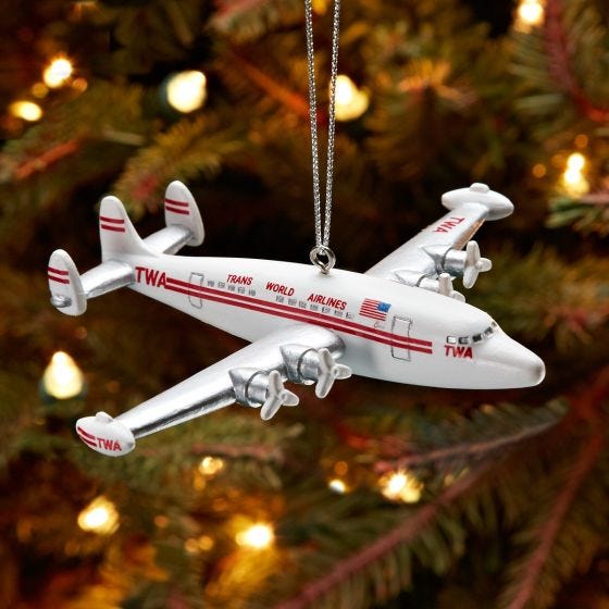 Nicknamed “The Queen of the Skies”, the TWA Super Connie is one of the most famous airplanes ever to take to the air. Crafted of a resin/marble mix, the Super Connie Ornament features painted graphics and a matching silver ribbon for easy display. Measures about 4”l x .25”h with a 4.25” wingspan.