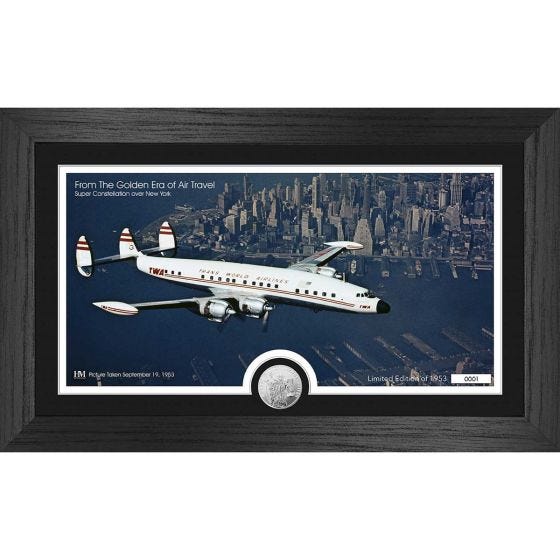 In December of 1950, TWA ordered their first round of Lockheed L-1049 Super Constellations, which became known as the Super Connie. In 1953, TWA offered nonstop transcontinental service using the Super Connie. This famous picture was taken in 1953 and features a Super Connie flying across the skyline of New York City in what would become a familiar sight to New Yorkers as the Super Connie would establish herself as an icon in New York skies for years to come. This Limited Edition Framed Print arrives double matted with a 39mm Minted Coin of the Statue of Liberty with an American flag and text that reads: “A Great Nation Stands United”. Measures 10”h x 18”w. Made in the USA.