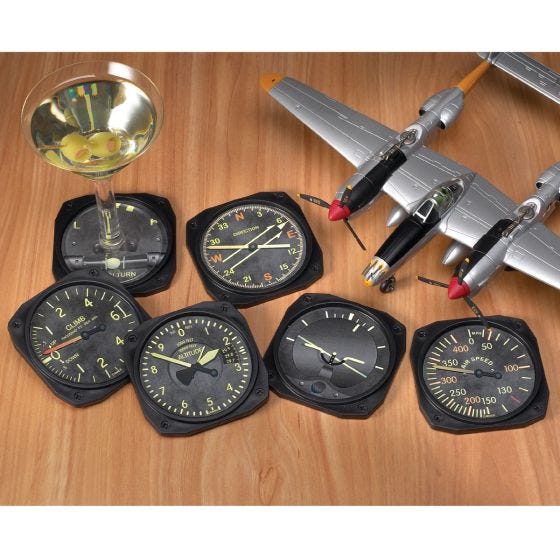 These Vintage Instrument Coasters are antiqued to resemble instruments from vintage aircraft. Each set is complete with Altimeter, Artificial Horizon, Air Speed Indicator, Rate of Climb Indicator, Turn & Slip Indicator, and RMI. To prevent sliding, they feature a soft, durable foam texture backing. Coasters are 3.25” or so in dia.